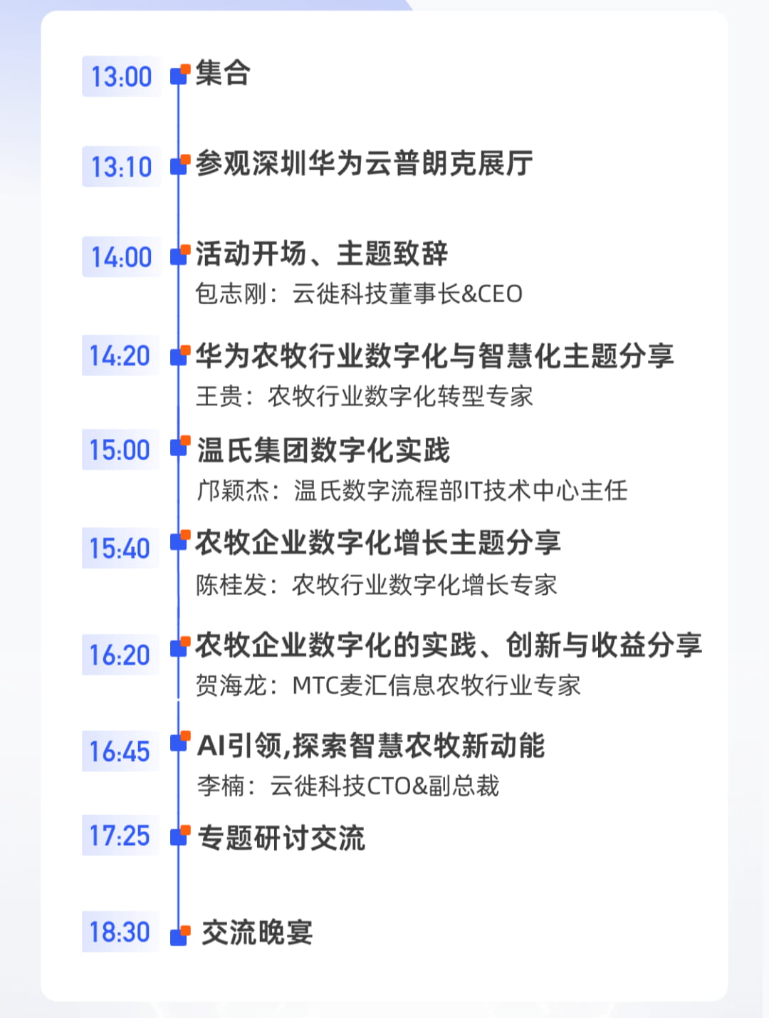 届时将汇聚农牧行业精英,共享经验,共探农牧行业数智化增长方案。同时将走进华为,切身感受华为人文环境和学习其领先的数字化转型经验成果。