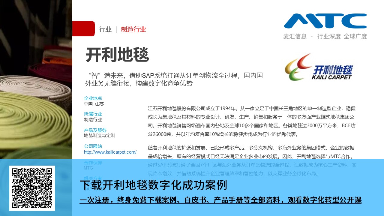 随着开利地毯的扩张和发展,已经形成多产品、多分支机构、多海外业务的集团模式,企业的数据量成倍增长,原有的经营模式已经无法满足企业多业态的发展。因此,开利地毯选择与MTC合作,通过SAP系统打通了全国7个厂区与海外业务从订单到物流的全过程,让数据成为核心生产资料,实现降本增效,并借助系统提升企业管理效率和管控能力,以支撑业务全球化布局。