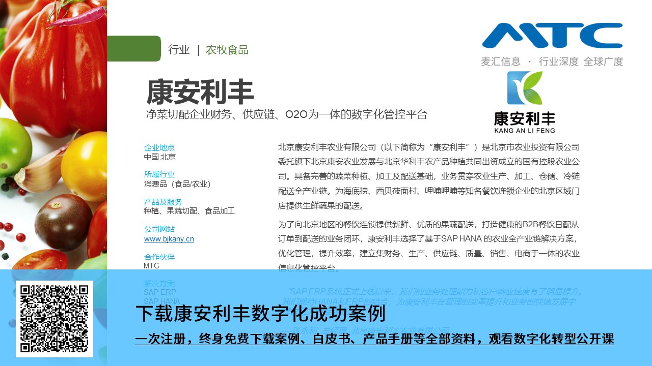 为了向北京地区的餐饮连锁提供新鲜、优质的果蔬配送,打造健康的B2B餐饮日配从订单到配送的业务闭环,康安利丰选择了基于SAP HANA 的农业全产业链解决方案,优化管理,提升效率,建立集财务、生产、供应链、质量、销售、电商于一体的农业信息化管控平台。