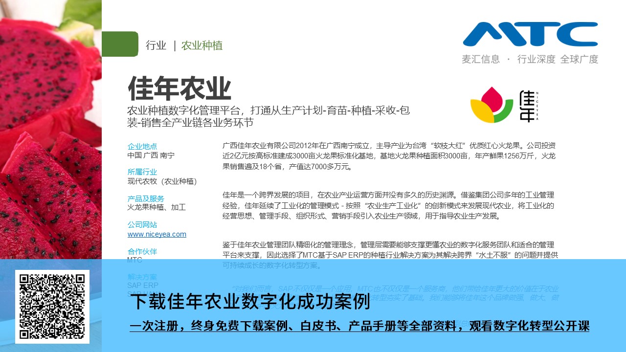 对我们而言,SAP不仅仅是一个应用,MTC也不仅仅是一个服务商,他们带给佳年更大的价值在于农业生产运营管理的理念指导,为企业未来数字化转型夯实了基础。我们能够将佳年这个品牌做强、做大、做久,致力于成为中国火龙果市场的领导者。