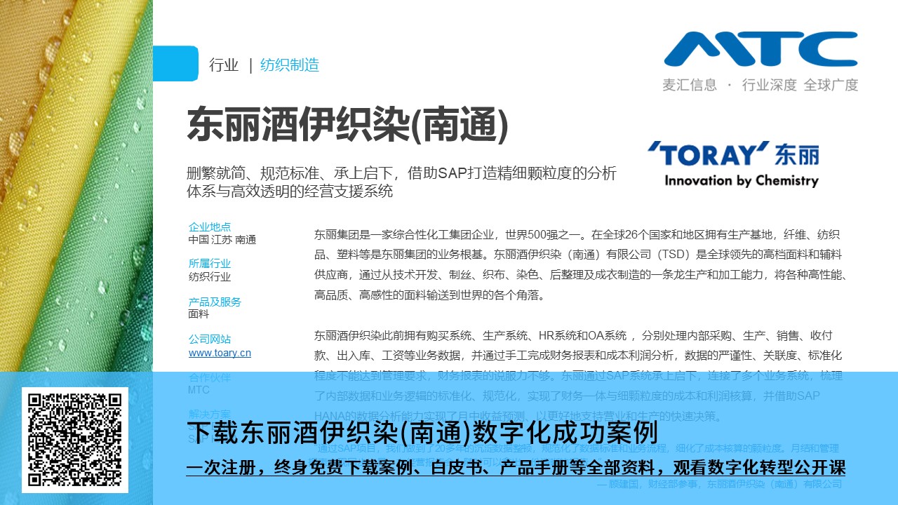 东丽酒伊织染(南通)此前拥有购买系统、生产系统、HR系统和OA系统 ,分别处理内部采购、生产、销售、收付款、出入库、工资等业务数据,并通过手工完成财务报表和成本利润分析,数据的严谨性、关联度、标准化程度不能达到管理要求,财务报表的说服力不够。东丽酒伊织染(南通)通过SAP系统承上启下,连接了多个业务系统,梳理了内部数据和业务逻辑的标准化、规范化,实现了财务一体与细颗粒度的成本和利润核算,并借助SAP HANA的数据分析能力实现了月中收益预测、以更好地支持营业和生产的快速决策。