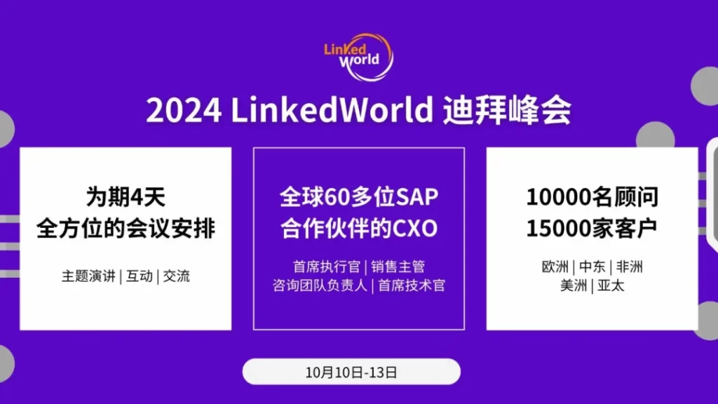 10月10日至13日,LinkedWorld(SAP全球合作伙伴联盟)将在迪拜举办2024年峰会。本次大会为期4天,邀请全球优秀SAP合作伙伴CXO及SAP高层,通过主题演讲、互动交流等系列活动,建设长期共赢的平台化生态体系,共创联盟崭新未来。