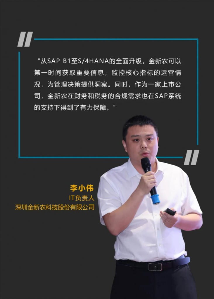 SAP:谢谢小伟总对 SAP 的肯定。外界能看到的是金新农在这几年沿着供应链上下游飞速扩张,建构多板块复合业务生态。其实在这种发展背后,是 IT 同步的升级、拓展。或者可以说,这是数字化转型中最有戏剧张力的一种形态吧?与业务同步赛跑的转型之路,金新农是如何保持同频的?有没有经验总结?