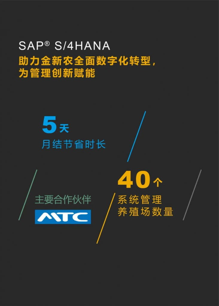 比如,金新农的这个信息化体系搭建完成之后,不仅仅是合规的工作变容易了,月结的财务同事感受也很明显。我们以前结账基本上每个月8号左右才结账,现在我们通过 SAP HANA 和 SAP BPC,每个月3号左右基本上在我们集团这边饲料板块和养殖板块全部结账,财务结账的时间、效率来讲是很明显的。这是一个 KPI。另外一个 KPI,我们整个仓库的准确性也得到了大大的提升,可能以前我们这个仓库数据还是比较乱,通过在建 HANA,供应链系统打通以后,我们仓库的准确性还有整个上下游供应链交货的节奏,效率也得到了大大的提升。