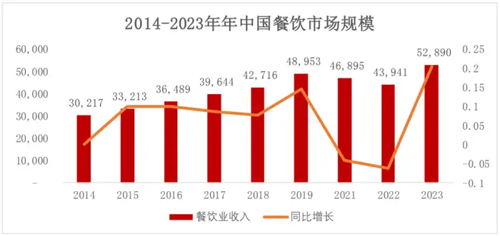 2023年餐饮业逐步恢复,全年餐饮市场收入52,890亿元,同比增长20.4%,中国餐饮市场规模从2014年的3.02万亿元增长至2023年的5.29万亿元,年复合增长率达7.25%。