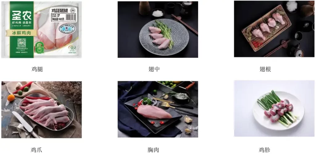 公司上游养殖、屠宰板块的主要产品为冻、鲜分割生鸡肉,主要面向餐饮企业、肉制品加工企业(B 端)以及 个人终端客户(C 端)等销售,部分产品展示如下: