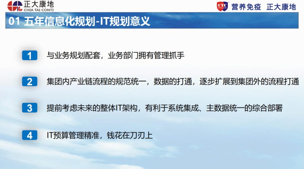 这一部分会与大家分享正大康地在SAP项目中到底有哪几个关键点,让项目得以顺利落地。首先一定要项目规划先行,规划包含了外部规划(如何选供应商)和内部规划(对企业内的业务梳理)。第二个是严格把控项目质量。第三个就是要培养非常高阶的关键用户和部门用户来帮助企业进行运维系统。最后一点要为未来的企业的中坚力量储备好知识,让他们能快速定位,融入新的岗位中。