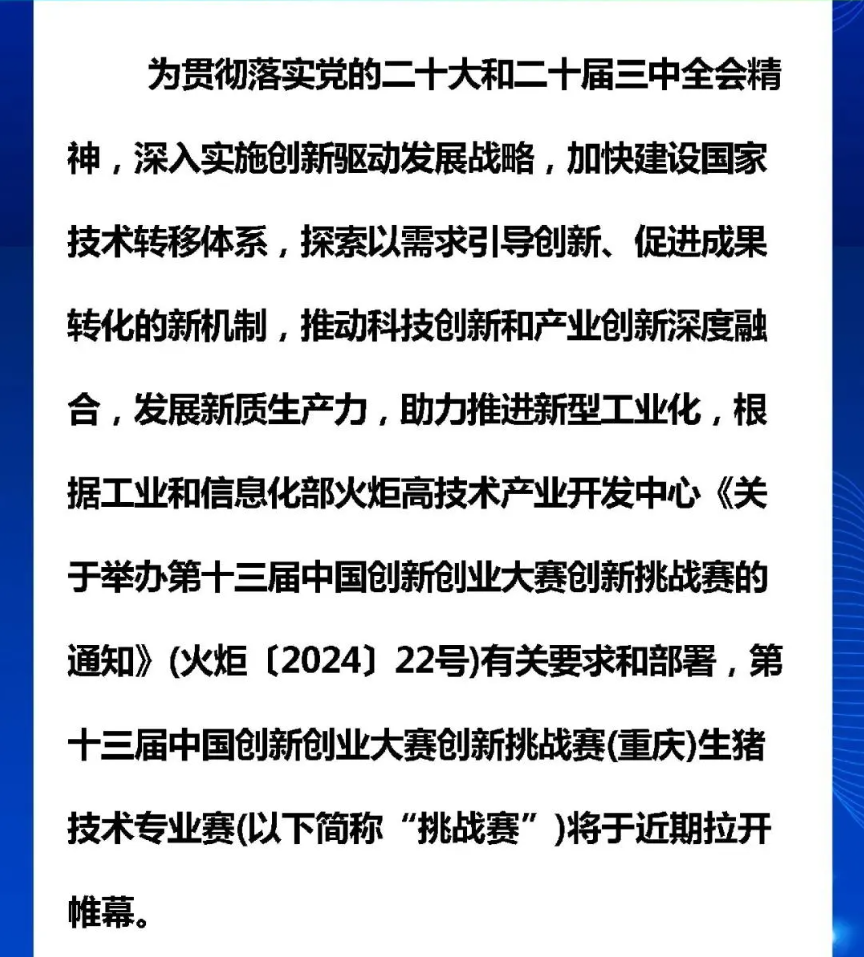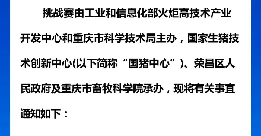 第十三届中国创新创业大赛创新挑战赛(重庆)生猪技术专业赛将于近期拉开帷幕。